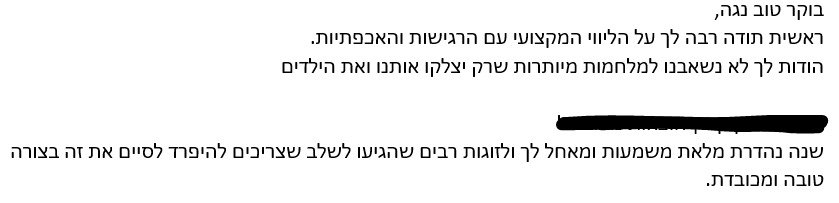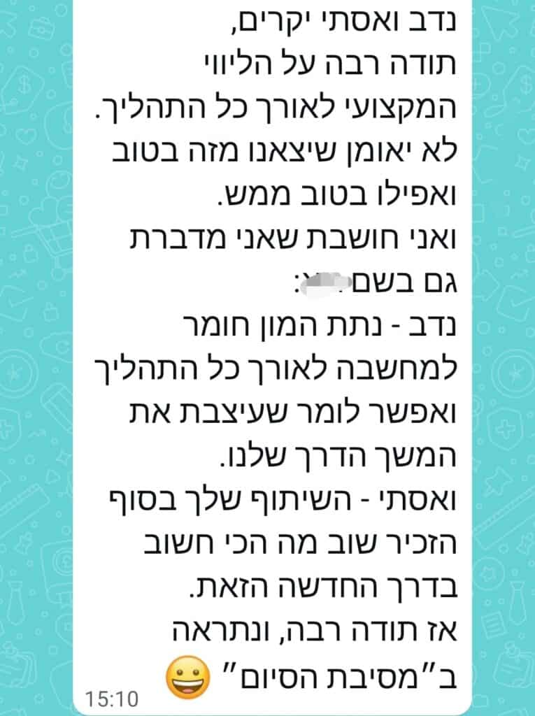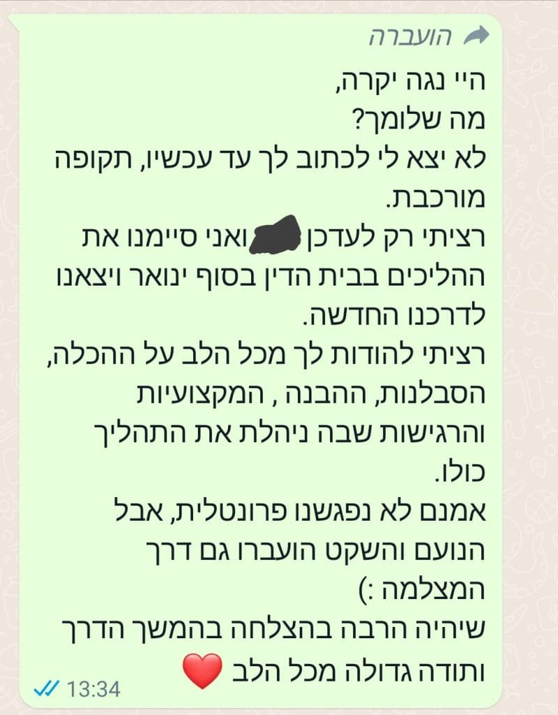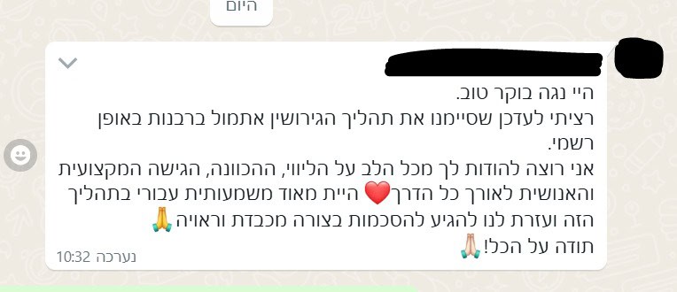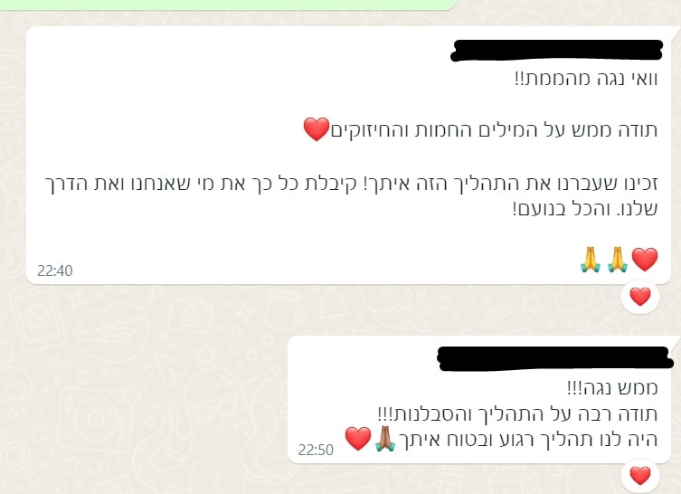 רציתי להודות לך מכל הלב על ההכלה, הסבלנות, ההבנה, המקצועיות והרגישות שבה ניהלת את התהליך כולו.